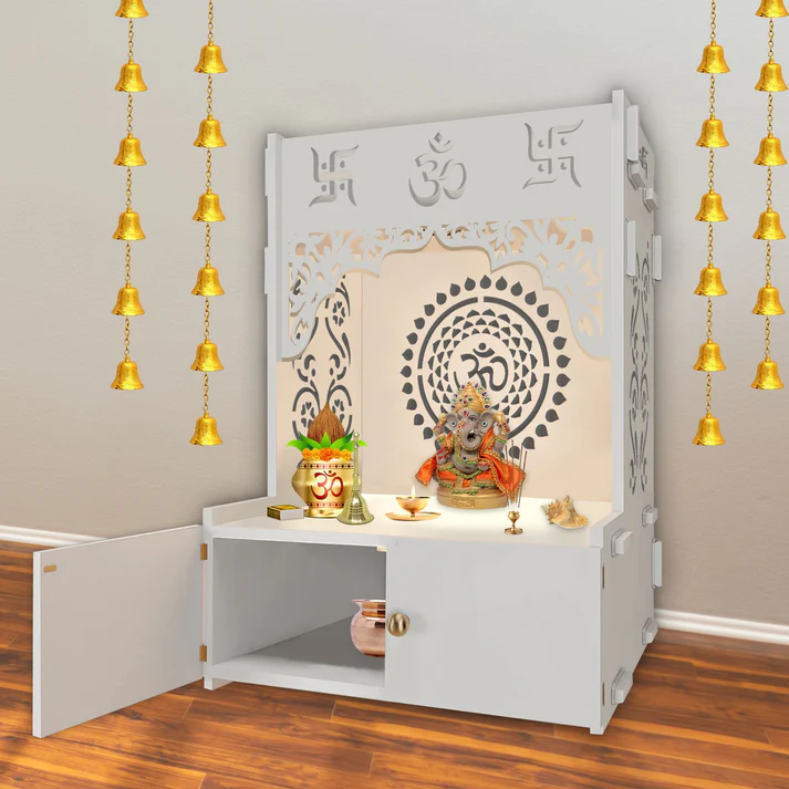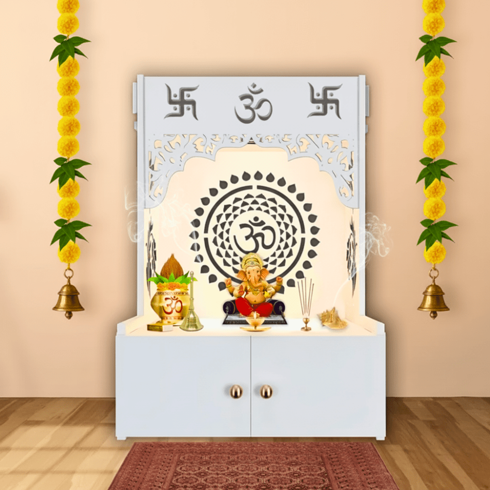 The Om Chakra design at the back adds a divine touch, while the built-in focus light gently illuminates your idols during prayers. Its spacious shelf gives you enough room to place idols, diyas, and other pooja essentials neatly.
