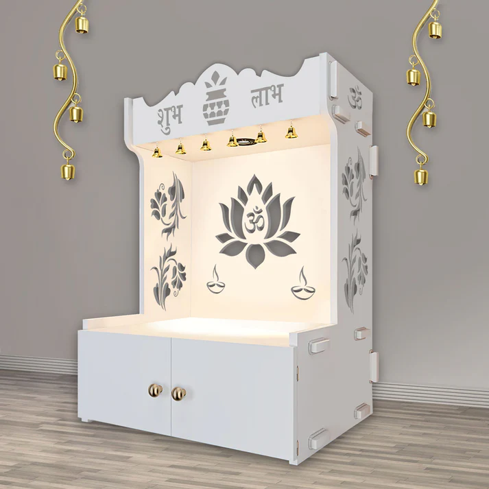 Crafted in a graceful white finish, the temple features a delicate lotus design that symbolizes purity and devotion. The spacious inbuilt shelf provides ample space for placing idols, diyas, incense stands, and other puja essentials, while the focus light inside gently illuminates your deity, creating a serene and divine atmosphere.