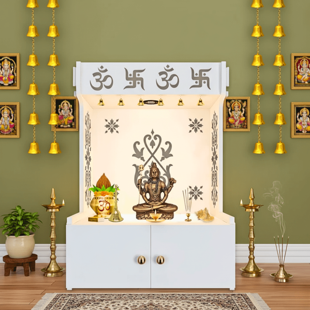 This temple includes a spacious wooden shelf that supports your puja essentials — incense, diyas, idols, books — all organized and within easy reach. The inbuilt focus light highlights the symbols and creates a serene glow, enhancing devotional mood in the evening or night.